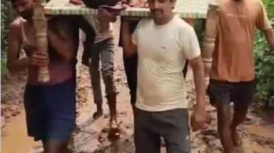 बीमार को अस्पताल ले जाने के लिए सड़क नहीं मिली, इंसानियत ने रास्ता बनाया – खाट पर 2 किलोमीटर चले गांव वाले