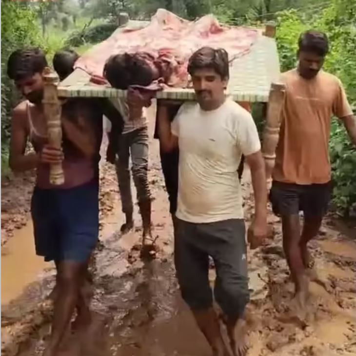बीमार को अस्पताल ले जाने के लिए सड़क नहीं मिली, इंसानियत ने रास्ता बनाया – खाट पर 2 किलोमीटर चले गांव वाले