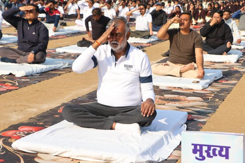नरसिंहपुर। प्रदेश शासन के पंचायत एवं ग्रामीण विकास व श्रम मंत्री प्रहलाद सिंह पटेल के मुख्य आतिथ्य में स्वामी विवेकानन्द जी की जयंती पर "युवा दिवस" के रूप में सामूहिक सूर्य नमस्कार का कार्यक्रम सोमवार को स्टेडियम ग्राउंड नरसिंहपुर में आयोजित हुआ। जिले के स्कूलों, कॉलेजों सहित अन्य संस्थाओं में भी सामूहिक सूर्य नमस्कार के कार्यक्रम आयोजित हुए। कार्यक्रम का शुभारंभ दीप प्रज्जवलन और स्वामी विवेकानंद जी के चित्र पर माल्यार्पण और राष्ट्रगीत वंदे मातरम् का सामूहिक गायन से किया गया। इस दौरान आकाशवाणी द्वारा सीधे प्रसारित कार्यक्रम के साथ सूर्य नमस्कार की सभी 12 मुद्राओं को क्रमवार किया और प्राणायाम का अभ्यास भी किया गया। सामूहिक सूर्य नमस्कार में प्रार्थना की मुद्रा, हस्त उत्तानासन, पादहस्तासन, अश्व संचालनासन, पर्वतासन, अष्टांग नमस्कार, भुजंगासन, पर्वतासन आदि 12 मुद्राओं का अभ्यास किया और अनुलोम- विलोम, भस्त्रिका एवं भ्रामरी प्राणायाम किया। इस अवसर पर स्वामी विवेकानंद जी के संदेश का प्रसारण किया गया। साथ ही मध्यप्रदेश के मुख्यमंत्री डॉ. मोहन यादव ने आकाशवाणी से अपना संदेश दिया।